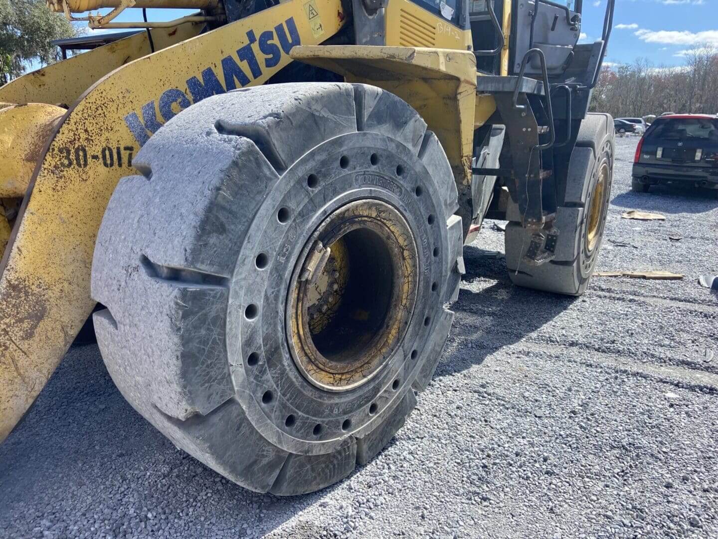 Below, starting on the left, is a picture of a worn solid 26.5-25 and a similar worn solid tire that has been rebuilt. The Cat 966G below is also running a set of rebuilt solid tires.